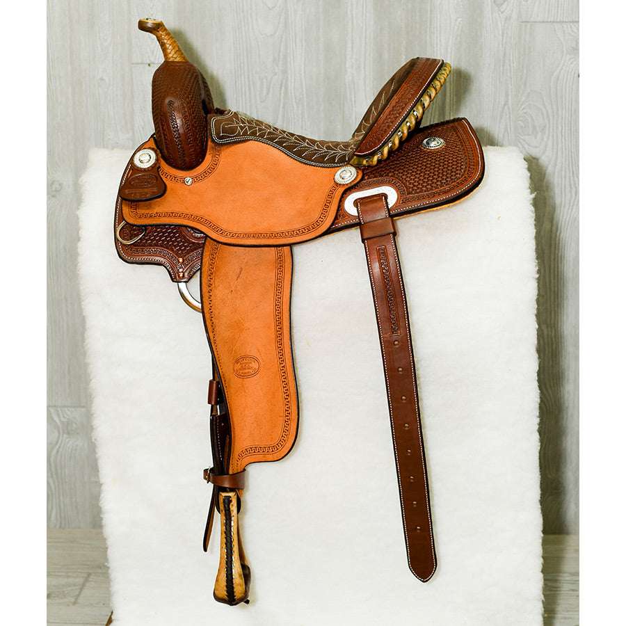 9 High Barrel – 1802 Saddle This 9 High Barrel, Running W & Basket saddle is expertly crafted to deliver maximum support and comfort for both rider and horse. Featuring a distinctive high barrel design and running W seat, this saddle enhances balance and control, making it a top choice for equestrians who demand reliability. The basket pattern detailing adds a classic touch of style while maintaining functional excellence. Key specifications include: High barrel height specifically designed for added rider support Running W seat to improve rider balance and posture Basket weave pattern providing both grip and aesthetic appeal Sturdy leather construction for durability and longevity Adjustable rigging for a custom fit to various horse builds Compared to standard saddles, the 9 High Barrel – 1802 stands out with its unique barrel height and running W structure, which offer enhanced stability and rider security during more intense riding sessions. This model outperforms traditional flat-seated saddles by focusing on ergonomic positioning and rider comfort without compromising the horse’s freedom of movement. Key Technical Advantages: The incorporation of the running W design revolutionizes rider balance by distributing weight more evenly across the saddle, reducing pressure points. The 9 High Barrel elevates rider posture, promoting a more natural alignment that improves control and reduces fatigue. Durable basket-patterned leather ensures the saddle maintains superior grip and resilience, even under demanding riding conditions. Altogether, these performance features make the 9 High Barrel – 1802 a professional-grade saddle suitable for serious equestrians seeking both style and function.
