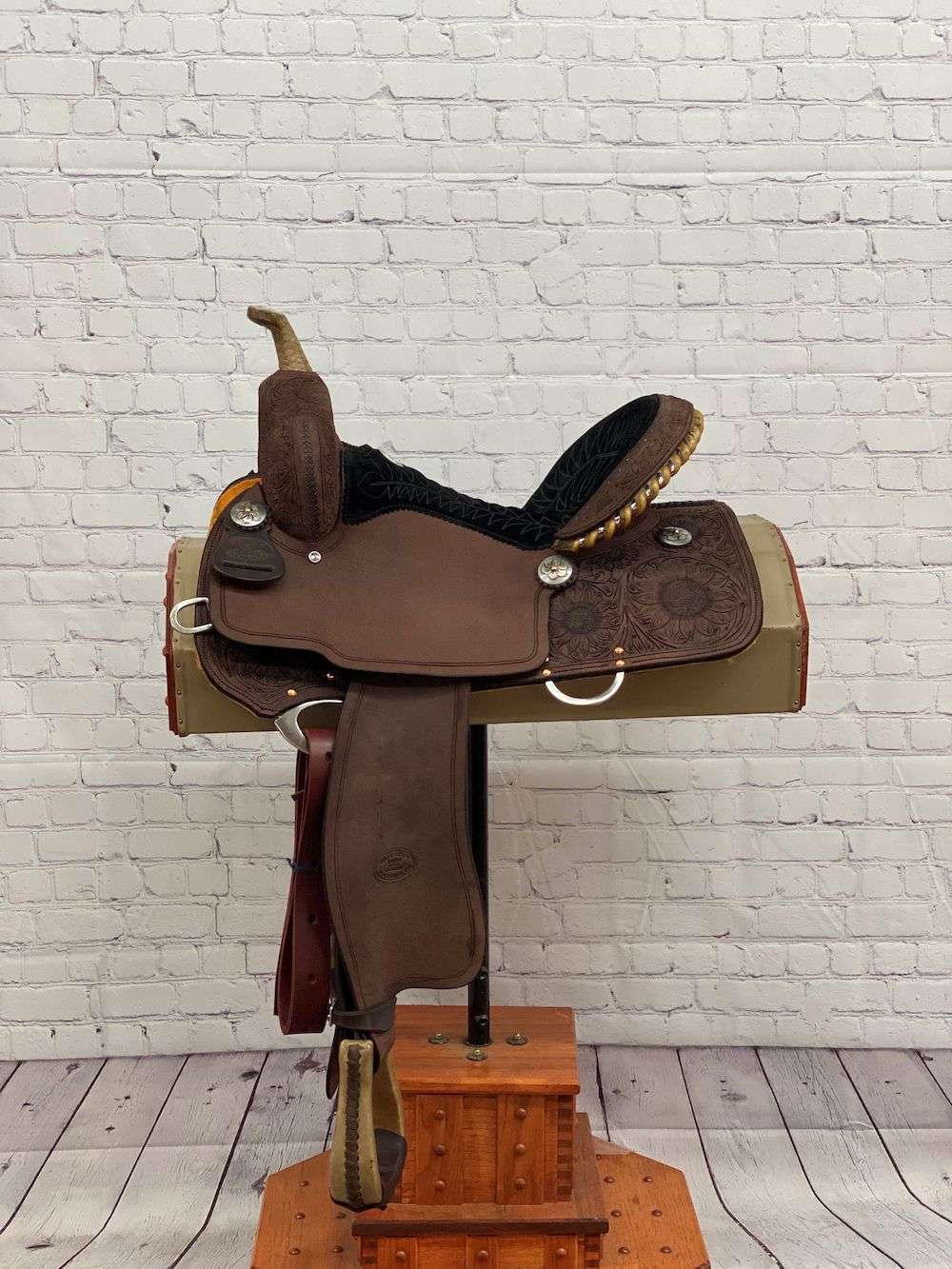 This 9 High Barrel All Rough Out, Inverted Sunflower, Cats Eye Rigging Billy Cook saddle is perfect for barrel racing and offers superior comfort and grip. The inverted sunflower design adds a unique touch, while the cats eye rigging provides secure handling during those thrilling races. Expertly designed for performance and durability.