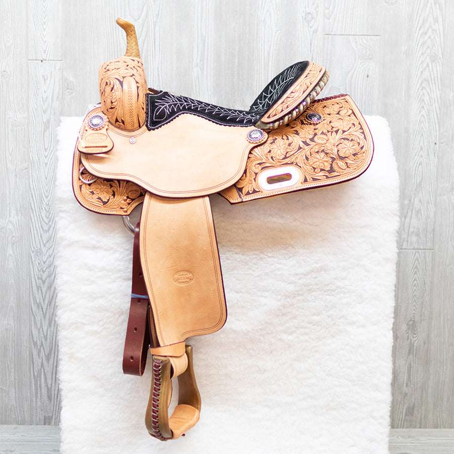 Bw Barrel 1/2 Breed Floral W/ Dyed Background Saddle This premium barrel racing saddle features a half-breed tree designed to deliver balanced performance and enhanced rider control. Expertly crafted with floral tooling and a dyed background, it combines aesthetic appeal with superior durability for demanding equestrian activities. Half-breed tree for optimal weight distribution and rider comfort Floral tooling for refined, detailed craftsmanship Dyed background enhances saddle longevity and appearance Designed specifically to support fast, precise barrel racing maneuvers Built to offer exceptional control and stability during competition Compared to standard barrel saddles, the Bw Barrel 1/2 Breed Floral W/ Dyed Background saddle excels in both style and functionality. Its unique half-breed tree offers greater balance than traditional designs, while the dyed background protects against wear, setting it apart from earlier models that lacked this treatment. This saddle is ideal for riders who require performance gear that does not sacrifice aesthetic quality. Key Technical Advantages: Technology and PerformanceThe incorporation of a half-breed tree ensures superior balance, reducing rider fatigue during high-speed barrel racing. Floral tooling adds a touch of elegance without compromising strength, while the dyed background provides resistance to fading and damage. This saddle’s construction supports powerful, precise maneuvers, elevating overall performance for competitive riders who demand both quality and style in their tack.