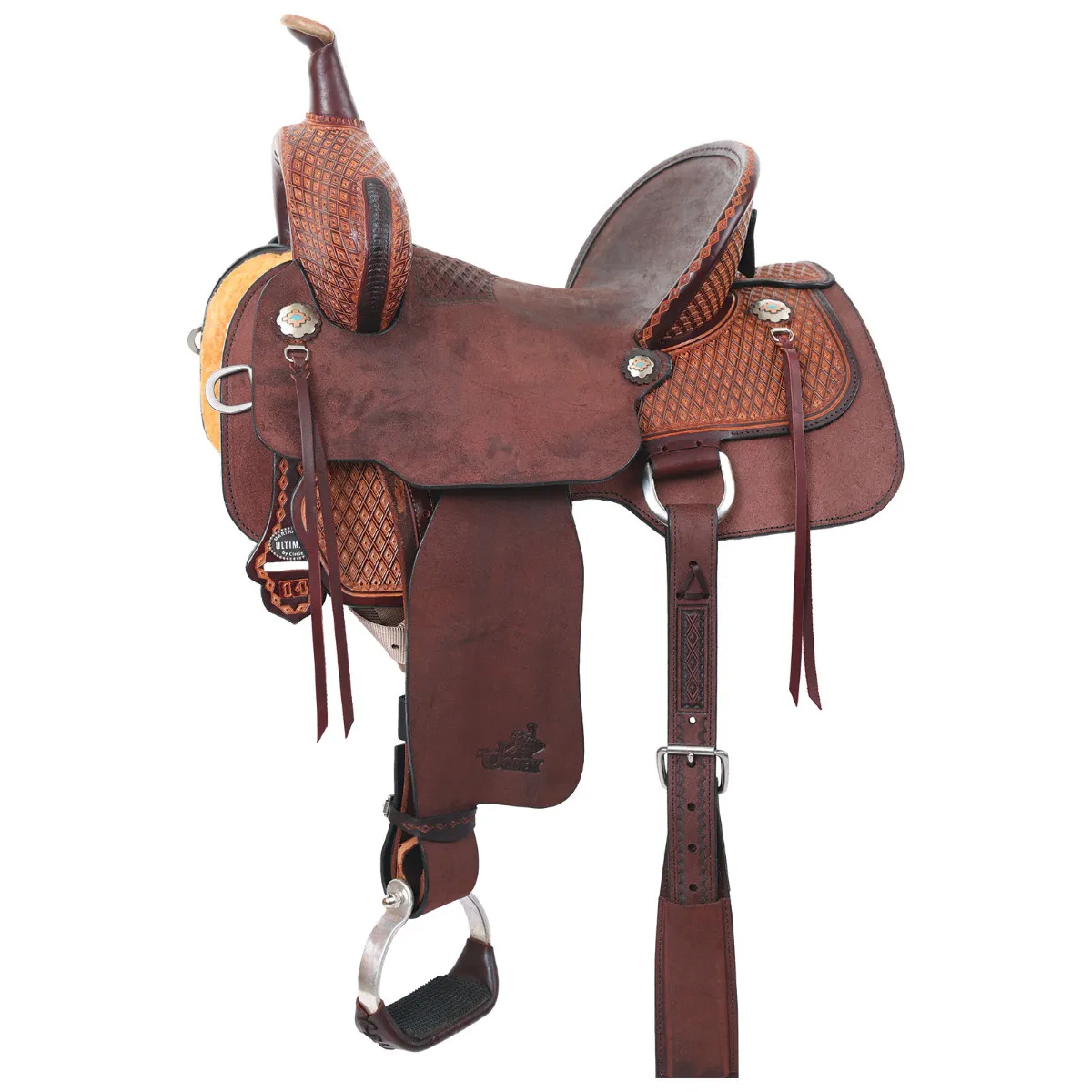 Description Specifications Named after Martha’s horse « Cash », it’s fancy enough to turn heads without being over the top. The Martha Josey Cash Money barrel saddle is a punchy look for the modern barrel racer with the hard seat pencil roll paired with the diamond tooling and turquoise conchos. The hard seat pencil roll puts you in close contact with the horse and the forward-hung stirrups aid in keeping your feet in front of you when competing. It’s got the popular Cash wood tree, which has a 5″ cantle and a taller 9″ swell, giving you a deep and secure seat. The 3-way rigging eliminates the need for a rear cinch because when both dees are used, it distributes the rigging pressure over a great area on the horse’s back. This saddle will help you win! All saddles are handmade in Yoakum, Texas. Martha Josey is a living legend within barrel racing through her competitive accomplishments and also through her highly sought-after year-round clinics. She is an 11-Time NFR Qualifier Barrel Racer, NFR World Champion 1980, WPRA and NBHA Champion, Olympic Gold Medalist Barrel Racer, and Clinician based in Marshall, Texas. Discipline: BarrelHorn: 4″ Tall, 2″ CapSwell: 4″ Tall, 2″ CapRigging: 3-Way Adjustable In-skirtTree Type: Ultimate Cash DURAhideTooling Type: Sparkling DiamondHardware: Copper AztecWarranty Type: 10 Year Tree Warranty, 1 Year CraftsmanshipCountry of Manufacture: United States