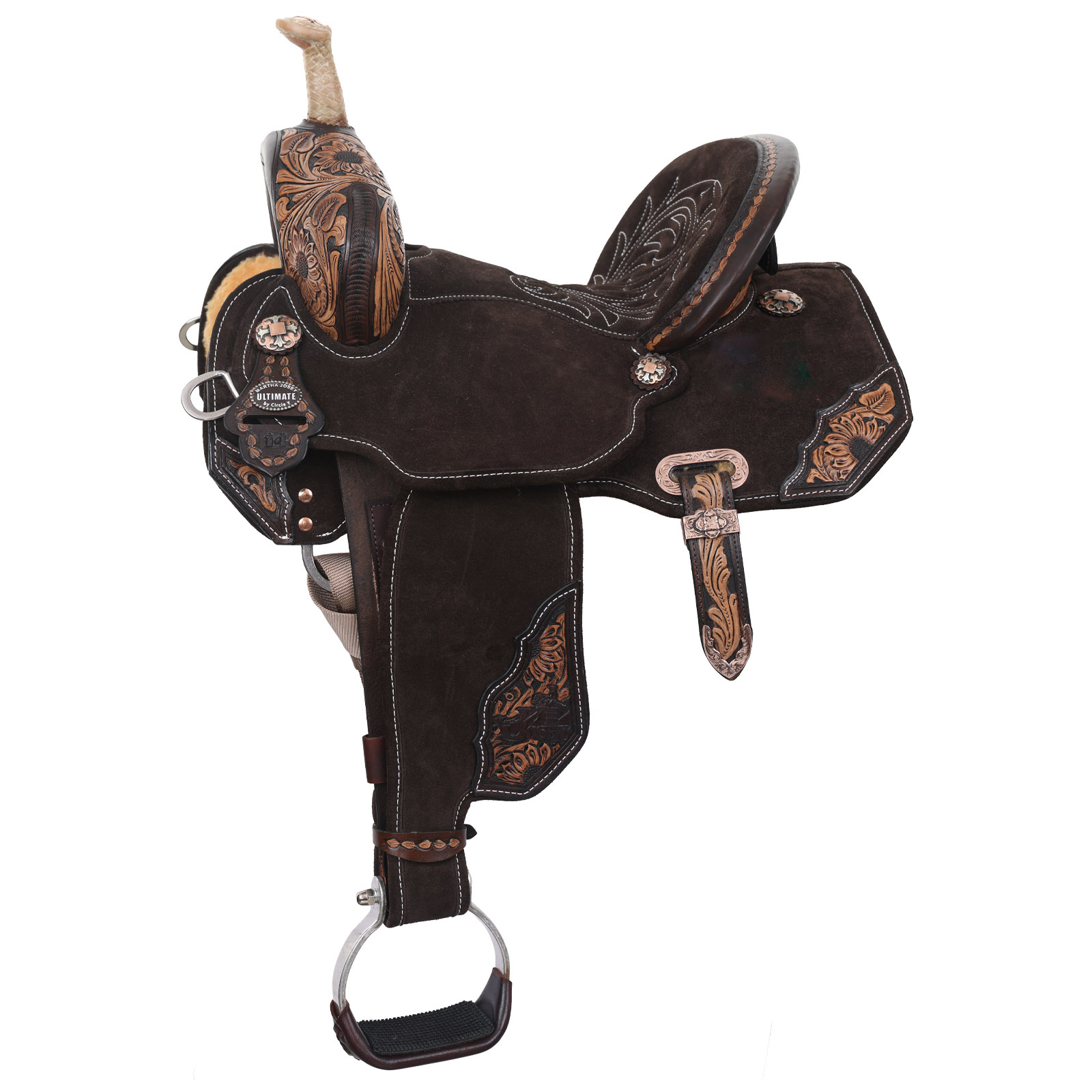 Description Specifications Travel at the speed of light like Martha, the Martha Josey Lightspeed is a modern take on the traditional barrel saddle. The saddle is built with synthetic skirting and lightweight leather, reducing weight on the horse’s back while maintaining durability for everyday riding and competition. The high cantle and deep seat keep you seated securely and in the correct position when running barrels, and it is the tool that will take you to the next level in your barrel racing career. It is lightweight and visually stunning, with dark chocolate roughout leather, ¼ hand-tooled sunflower tooling, and matching copper conchos and hardware. Rigging: 3-Way Adjustable In-SkirtHorn: 4″ Tall, 2 1/4″ CapTree Type: Ultimate DURAhideSkirt Length: 13 1/2″ D x 24 1/2″ LSwell: 13″Cantle Height: 5″Other Upgrades: Braided Horn, Embroidered Flag, Tooled OverlaysDiscipline: BarrelHardware: Copper Patina CrossTooling Type: 1/4 SunflowerWarranty Type: 10 Year Tree Warranty, 1 Year CraftsmanshipCountry of Manufacture: United StatesWeight: 24 lbs