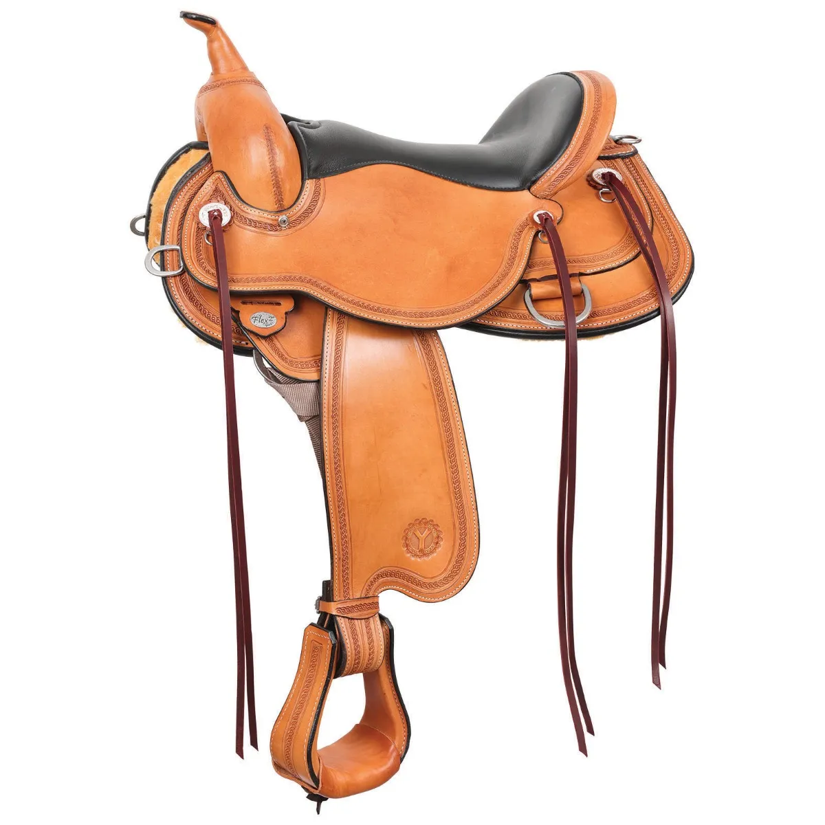 Description Specifications If you like to feel a little more connected to your horse on the trail, the Pioneer Flex2® Trail Saddle is built for that kind of ride. It offers a closer feel without giving up comfort, making it a solid choice for riders who want more precise communication while still staying comfortable over long miles. Why Riders Choose the Pioneer Flex2® • Close contact skirt design brings your leg closer to the horse for more precise cueing • Moderate seat with 4″ cantle and 13″ swell offers balanced, all-day comfort • Impact Foam™ seat cushions the ride over long trail miles • ErgoBalance™ stirrups help reduce knee and ankle strain for better comfort and alignment • Lightweight design makes it easier to handle and ride for extended periods The close contact skirt allows your leg to sit closer to your horse, making it easier to communicate subtle cues while riding. The moderate seat keeps you balanced and comfortable without locking you into position. It’s the kind of saddle that feels responsive when you need it, but still comfortable enough for long hours on the trail. Designed for riders who value both feel and comfort, the Pioneer Flex2® Trail Saddle combines a close contact skirt with practical trail features. The skirt shape reduces bulk under your leg, helping improve communication while maintaining a traditional western look. The 3-way adjustable in-skirt rigging allows you to position the saddle to suit your horse, while also creating a closer, more comfortable fit under your leg. Impact Foam™ in the seat helps absorb shock and distribute pressure, something riders notice as the ride stretches into several hours. ErgoBalance™ stirrups are designed to tilt and reduce torque on knees and ankles, helping promote a more natural and balanced riding position. Frosted beaded conchos and simple tooling give the saddle a clean, classic look that stands out without being overdone. This saddle is built on Circle Y’s Flex2® tree, a design that revolutio