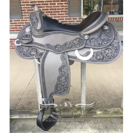 made from Tannery Drum Dyed Gray leather Disclaimer: Like all leather products and leather colors, even though it is drum dyed the leather will eventually oxidize due to exposure to the elements and may change color over time comes standard with Black sheepswool skirt lining and Black Don Orrell stirrups Gorgeous Black inlay silver trim overall length 28″ approx. 36 lbs.