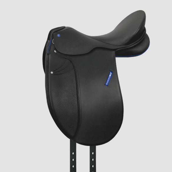 Looking for an extra-classy dressage saddle? The PASSIERBLU Style is the perfect saddle for you! A sparkling Premium Crystal and three curved patent leather inlays on the knee inserts make this saddle the highlight in the dressage arena. The blue trim on the flap and the gusset is an additional attractive feature. The super-comfortable, deep seat, the thick thigh supports and the doubling on the small saddle flaps are designed to ensure the perfect riding position for a secure and relaxed time in the saddle. The PASSIERBLU Style saddle is an exceptional example of the youthful spirit of the PASSIERBLU Collection! And of course, always comes with the original PASSIERBLU head nail and the PASSIERBLU stirrup strap loop! The saddle is available with sparkling Premium Crystals and design variations on the cantle. European Calf leather Seat and panels: Selloil leather; knee inserts: Selloil leather with Premium Crystals and Patent leather inlay; small saddle flaps: softly doubled with Selloil leather; gusset and front of flap: blue Patent leather trim Synthetic saddle tree, deep seat, thick thigh supports SP10, 2 x 70 cm (28″) billets with point billet straps, freedom panels