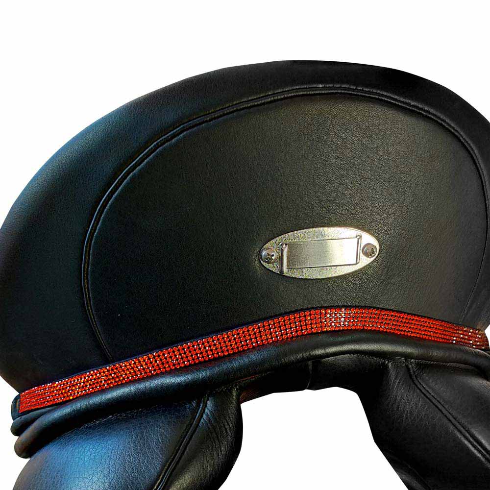¡Dale brillo a tu silla de montar! Dale un toque original adornándola con la tira decorativa Zaldi. ¡Dale!!! Fácil de colocar mediante los lazos elásticos ajustables por debajo del faldón. Dale un toque de brillo y color con la tira decorada con pedrería de colores. ¡Dale color!!! Gran variedad de colores, combinaciones y anchos. Ancho tira: 1.1 cm Largo tira: 31 cm Color: cristales brillantes rojos. Ver video para saber cómo colocar la tira en la silla.