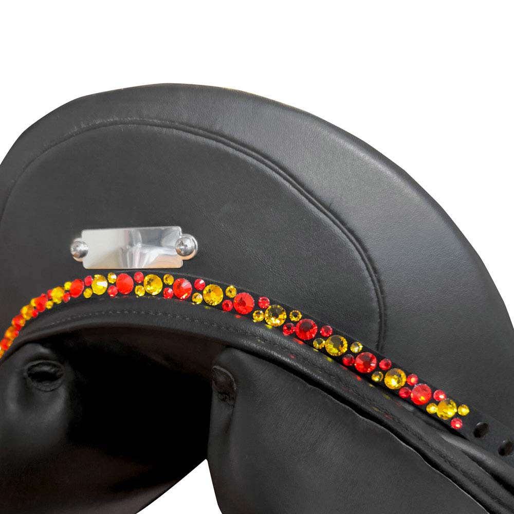 ¡Dale brillo a tu silla de montar! Dale un toque original adornándola con la tira decorativa Zaldi. ¡Dale!!! Fácil de colocar mediante los lazos elásticos ajustables por debajo del faldón. Dale un toque de brillo y color con la tira decorada con pedrería de colores. ¡Dale color!!! Gran variedad de colores, combinaciones y anchos. Ancho tira: 1 cm Largo tira: 31 cm Color: cristales rojos y amarillos. Ver video para saber cómo colocar la tira en la silla.