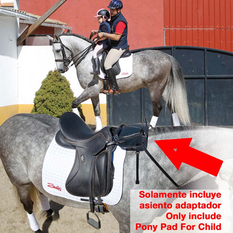 Asiento adaptador para silla que permitirá iniciar a los más pequeños en la equitación y siempre acompañado de un adulto. equipado con asa de seguridad en la parte delantera, correas para sujetar a la silla del adulto y pechopetral al caballo. se suministra con las aciones pero no incluye los estribos. color Negro.