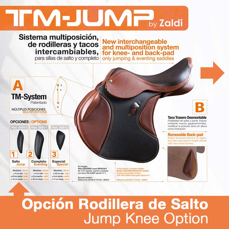 Tm-jump de zaldi para salto y completo. sistema multi-posición, de rodilleras y tacos intercambiables, para sillas de disciplina de salto y completo. ¡más apoyo y seguridad en tu salto! con nuestro tm-system en taco delantero regulable en inclinación y altura. además de 3 posibilidades de taco delantero. y taco trasero desmontable, con posibilidad de quitar y poner. incluso mediante nuevos agujeros/tornillos, modificar la posición. * salto (ref. 00910). medidas ± 4 cm.de alto x ± 4.5 cm. de ancho x ± 16 cm. de largo. * Completo (ref. 00911). Medidas: ± 4 cm. de alto x ± 6 cm. de ancho x ± 20 cm. de largo. * Especial (ref. 00912). Medidas: ± 3.5 cm de alto x ± 6 cm. de ancho x ± 14 cm. de largo. Así por ejemplo en la imagen, Silla LEDYARD cuero BOXCALF de 17,5” bicolor, marrón y tostado, con taco TM-JUMP opción nº 1.Al realizar tu pedido, solamente debes unir la opción a la referencia de la silla elegida. Ejemplo: referencia 00158 9 175 93 (silla) + 00910 (opción nº1 TM-JUMP). DE FÁBRICA LA SILLA SALE SOLAMENTE CON LA OPCIÓN ELEGIDA. LAS DEMÁS OPCIONES SE PUEDEN ADQUIRIR POR SEPARADO.