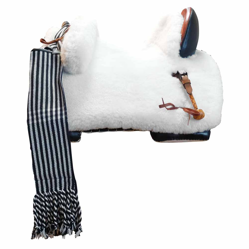 Silla vaquera completa (incluye cincha, ación, estribo y baticola). Incluye manta estribera de rayas. Armadura de fibra. Baste de goma. Estribera vaquera. Estribo de fibra. Zalea de borreguillo natural. Peso de la silla sin equipo: 6.400 kg Medida de perilla a concha: 45 cm Medida del hueco del asiento: 32 cm Largo del baste: 58 cm