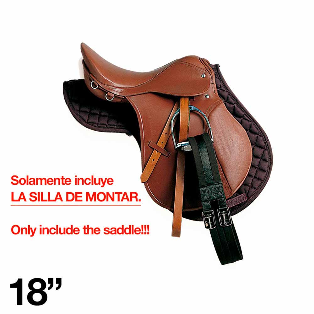 Silla inglesa de uso general de 18″. Fabricada en cuero. Estribera seguridad. Medida del baste: 48 cm. Medida del faldón: 42 cm. Colores: Negro, Marrón, Avellana.