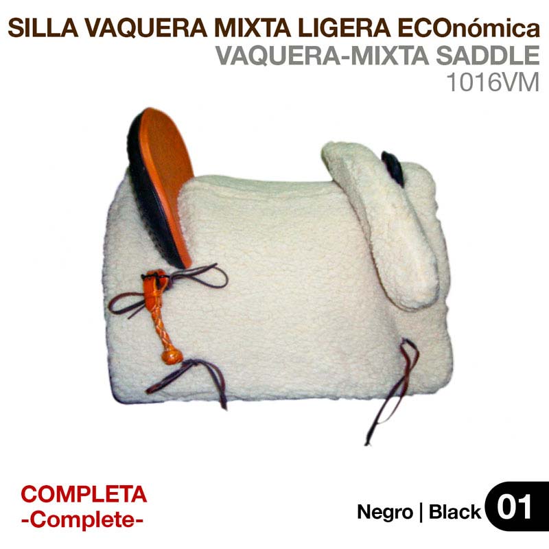 Silla vaquera mixta completa (incluye cincha, ación, estribo y baticola). Zalea de borreguillo sintético. Peso de la silla sin equipo: 6.500 kg. Medida del hueco del asiento: 34 cm. Medida del borrén: 56 cm. Largo del baste: 56 cm. Color: Negro.