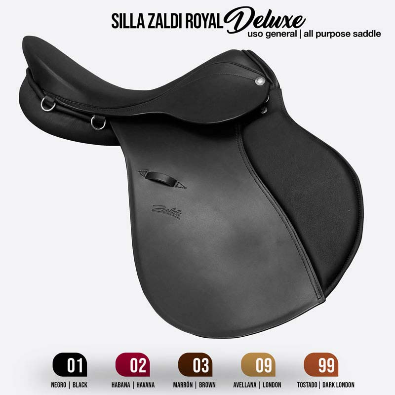 Además de una relación calidad precio incuestionable, esta silla reúne cualidades que marcan la diferencia entre las sillas de Uso General. Buen cuero, armadura flexible, diseño ergonómico… se traducen en libertad de movimiento, contacto con el caballo y confianza. Muchos jinetes de todo el mundo apuestan por ella. Faldones fabricados con cuero crupón (4 mm) de calidad 1ª extra. Bastes de goma. Realizada en pieles europeas de crupón y boxcalf seleccionadas. Asiento de goma látex. Faldón: mixto. Rodillera/Taco interior. Rodillera exterior forrada de piel. Armadura fabricada en materiales especiales, con la tecnología más avanzada. Garantía de 10 años. Estriberas inoxidables de seguridad. Latiguillos cortos. Medidas: * Jinete: 16″, 16.5″, 17″ 17.5″ 18″. * Cruz del caballo: de 28 cm. a 34 cm. Colores: actualmente además de los clásicos colores negro, marrón, habana, avellana, tostado; se pueden realizar múltiples combinaciones en colores de cuero, hilos, vivos, burletes… Por ejemplo el modelo de la imagen es bicolor en tostados con burletes en negro. OPCIONAL: Puedes encargar tu silla Zaldi con más piquetes delanteros o traseros, para alforjas o pechopetrales… Las sillas de uso general (o mixtas) no son específicas para ninguna disciplina hípica pero nos sirven para casi todo. De tal forma que las podemos utilizar tanto para doma, salto, cross, marcha, endurance…. siendo ideal para los jinetes que no tienen una displina muy definida. MEDIDAS: * Jinete 16″ (largo de 41 cm. desde el borrén trasero de la silla al clavo Zaldi). * Cruz del caballo: de 28 cm. a 34 cm. * Peso: 5.600 Kg. * Largo del faldón desde la estribera: 36 cm. * Largo del baste por debajo: 45 cm. * Área de apoyo del baste sobre el lomo del caballo: 40 cm. * Rodillera interior: 15 cm. x 6 cm. x 4.5 cm.